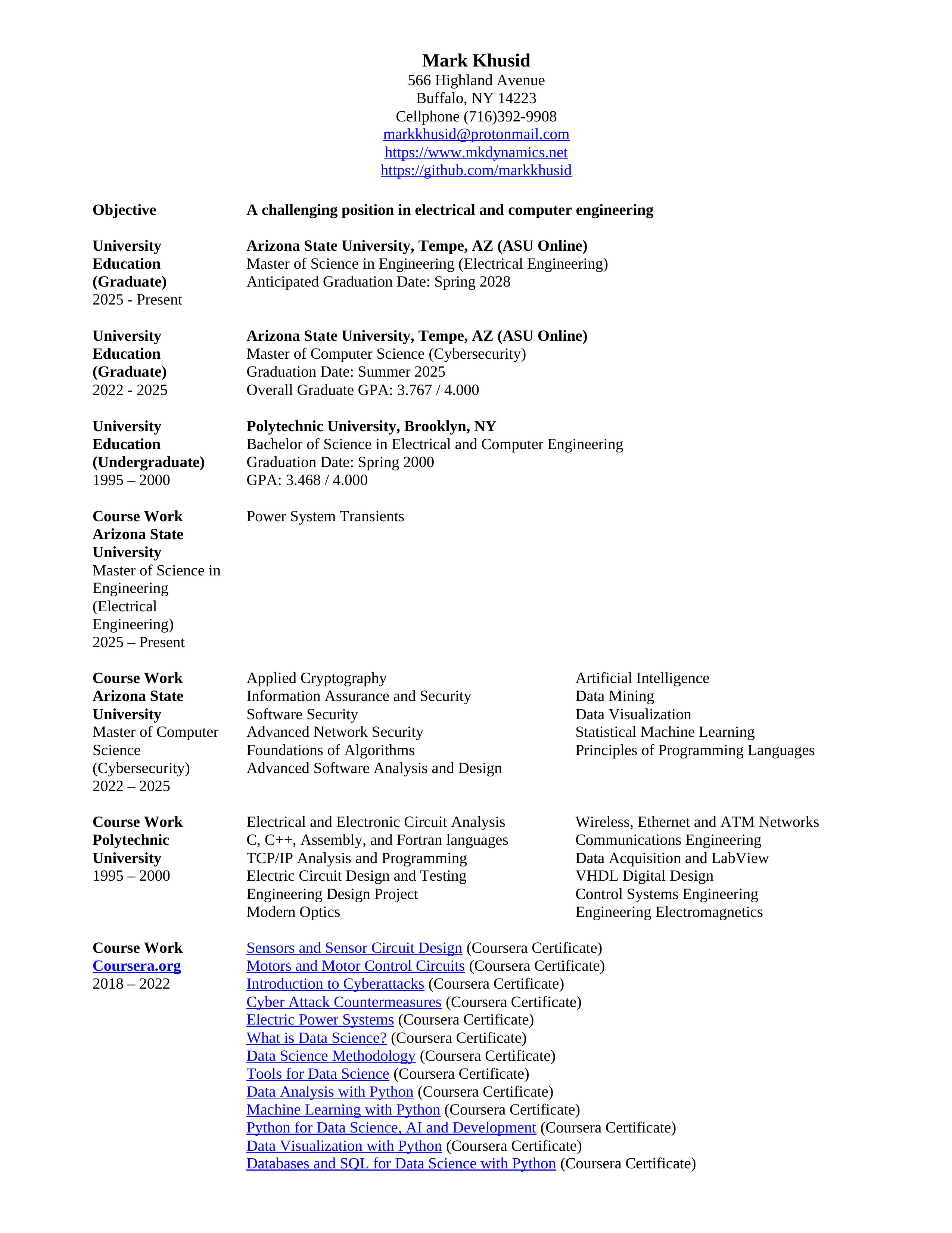 Mark Khusid is an electrical engineer in the aerospace industry and a graduate student at Arizona State University. He has a Bachelor of Science in Electrical Engineering and Computer Engineering from Polytechnic University in Brooklyn, N.Y., as well as a Master of Computer Science (Cybersecurity) from Arizona State University. He has worked in the aerospace industry for over 11 years and is a licensed amateur radio operator (Extra Class).